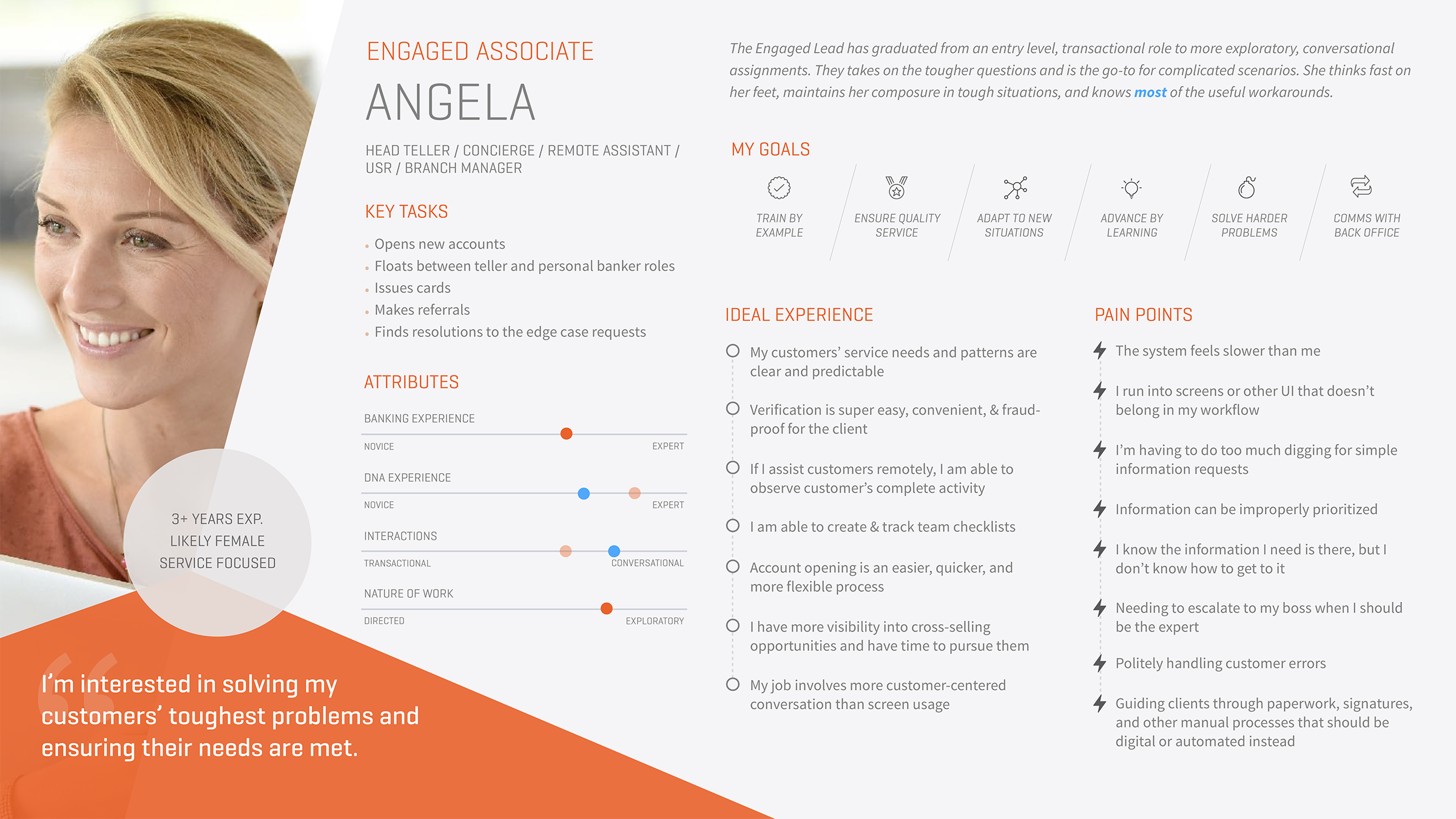 After multiple research engagements, Fiserv brought us in for additional research with bank tellers and service agents to better understand the full service life cycle and simplify the software user experience so they could do a better job serving customers and cross-selling banking products. Our team spent time in branches across the country and delivered synthesized research findings, detailed personas and journey maps, and a prioritized list of product improvement opportunities to inform future roadmap prioritization.