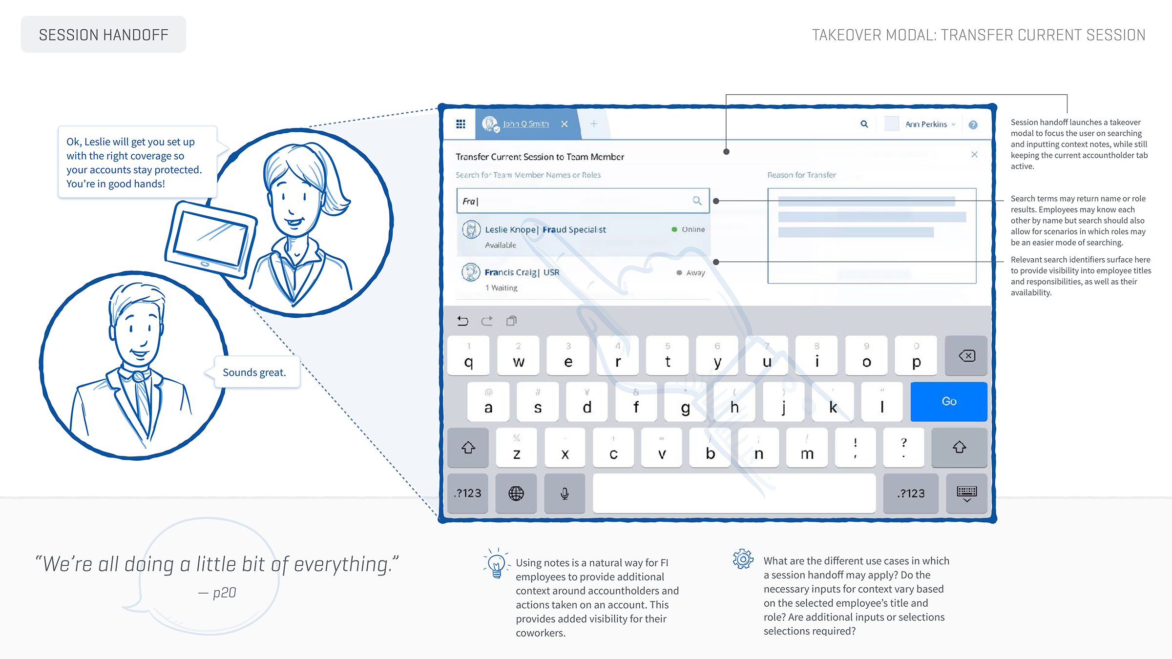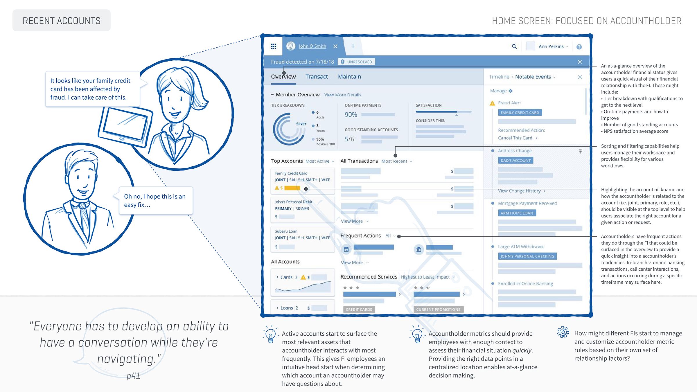 Based on the research and working with Fiserv to prioritize key opportunities, our team create a new design concept for the platforn that put the accountholder relationship front and center. The new experience included an intelligent system that provides recommendations to aid decision-making and a streamlined workflow for tellers and agents resulting in faster accountholder interactions, improved security and customer service, and fewer mistakes with critical banking transactions.